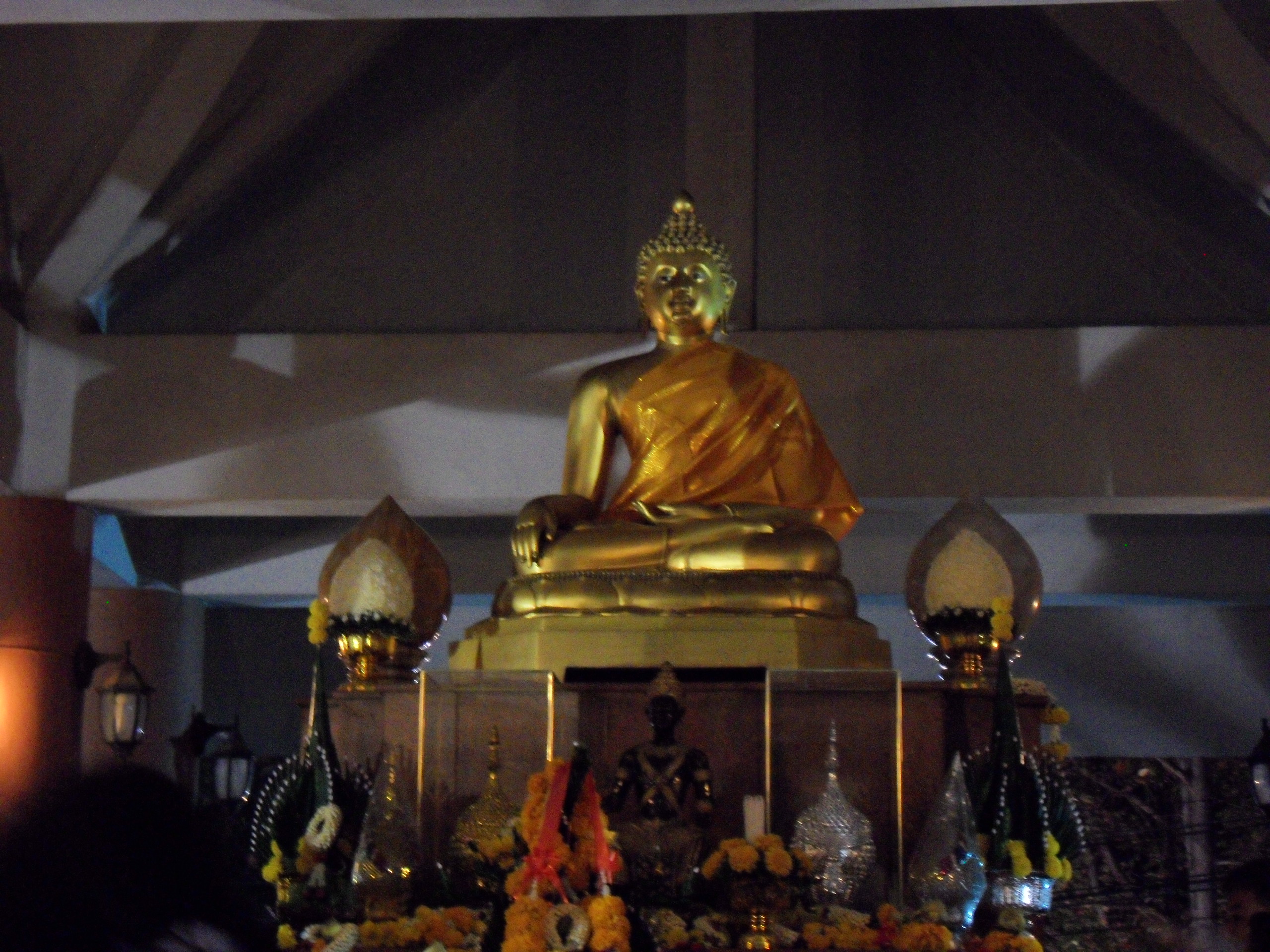 A statue of the Buddha, with in front of it a statue of the figure with magical powers, who is linked to the area of this university.